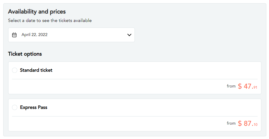 After customers select a date in the calendar, they are presented with available ticket options for that date: