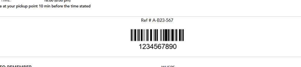 In the example below, a barcode is displayed with the written code below the image and an activity provider's reference number above it: