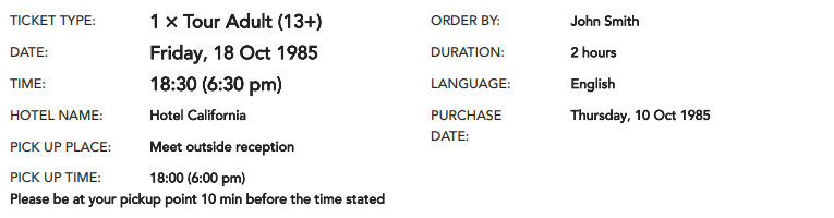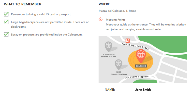 This section contains important details that customers need to know for their booking. The example below shows a section with details regarding attraction restrictions, instructions for meeting a guide and the name of the customer: